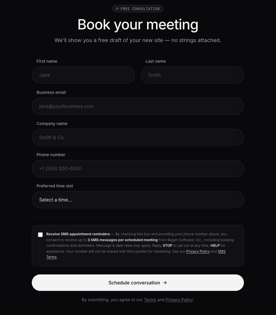 Agent: “Before we wrap up — would it be okay if we sent you SMS reminders about this meeting? You'd get a confirmation now and a reminder before the call. Regen Software would send up to 3 messages per meeting. Message and data rates may apply. Consent is not a condition of purchase. You can reply STOP at any time to opt out, or HELP for assistance. Do you agree to receive SMS messages from Regen Software at the number you've provided today?”